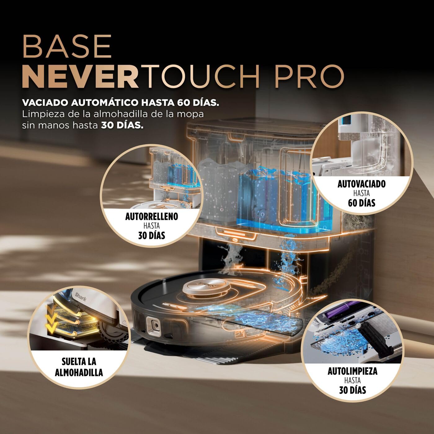 - EXCLUSIVO EN AMAZON: Robot aspirador y mopa 2 en 1 que regresa a su base NeverTouch para vaciar la suciedad, rellenar el agua y limpiar la mopa automáticamente. La base almacena hasta 60 días de suciedad y 30 días de agua limpia