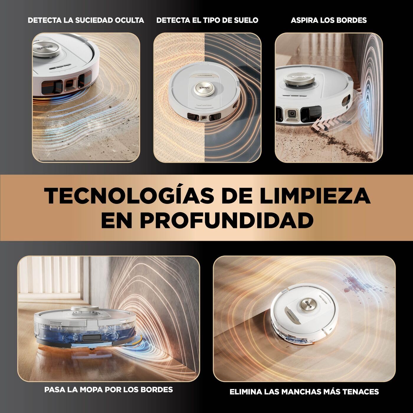 - 5 TECNOLOGÍAS DE LIMPIEZA PROFUNDA: PowerDetect se ajusta automáticamente a las necesidades de tu hogar y maximiza la eficiencia en cada pasada. Detecta y reacciona a la suciedad, manchas húmedas, esquinas, bordes y todo tipo de superficies